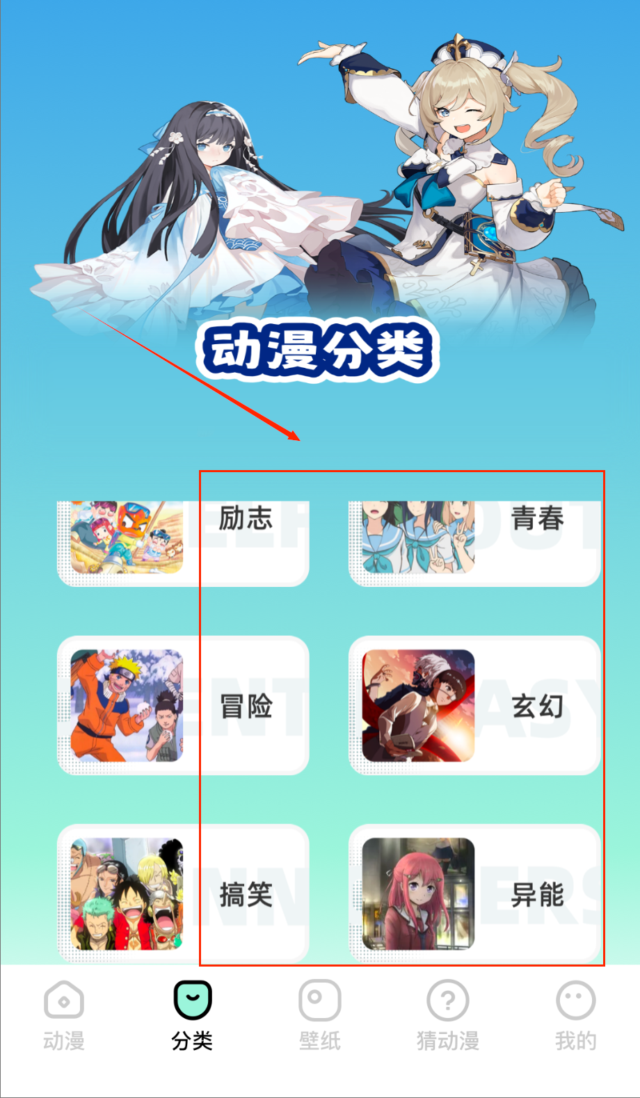 2、分类页面细致划分动漫类型,每个分类都配有精美封面图,点击进入后能看到该分类下的热门作品列表,方便系统性观看。