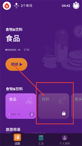 1、在话题页面点击【饮料】选项,会触发话题锁定提示,这类内容需要解锁才能学习哦。