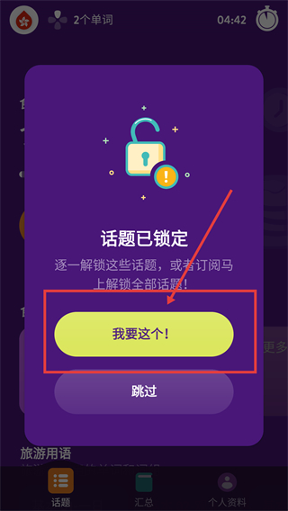 2、遇到话题已锁定弹窗时,点击【我要这个!】按钮,就能进入解锁相关的操作流程啦。