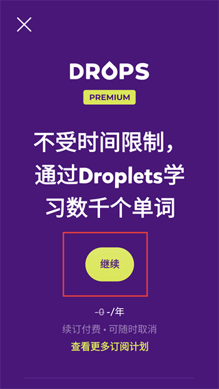 4、验证通过后进入订阅页面,点击【继续】按钮可了解DROPS-PREMIUM的订阅详情,解锁更多学习内容哦。