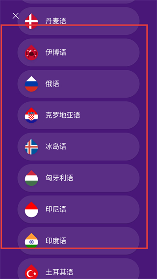 3、在语言列表里可以看到【丹麦语】【俄语】等多种语言选项,选好后就能切换学习语种哦。
