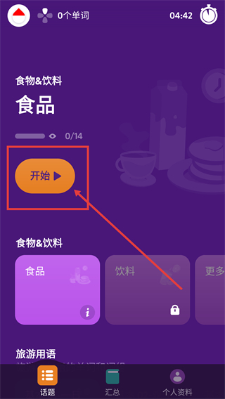4、返回主界面的【食品】板块,点击【开始】按钮,就能开启该板块的语言学习内容啦。