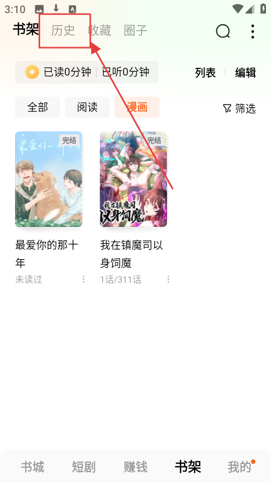 2、进入书架后,点击【历史】标签,就能看到之前浏览过的内容记录,找起来很轻松呢。