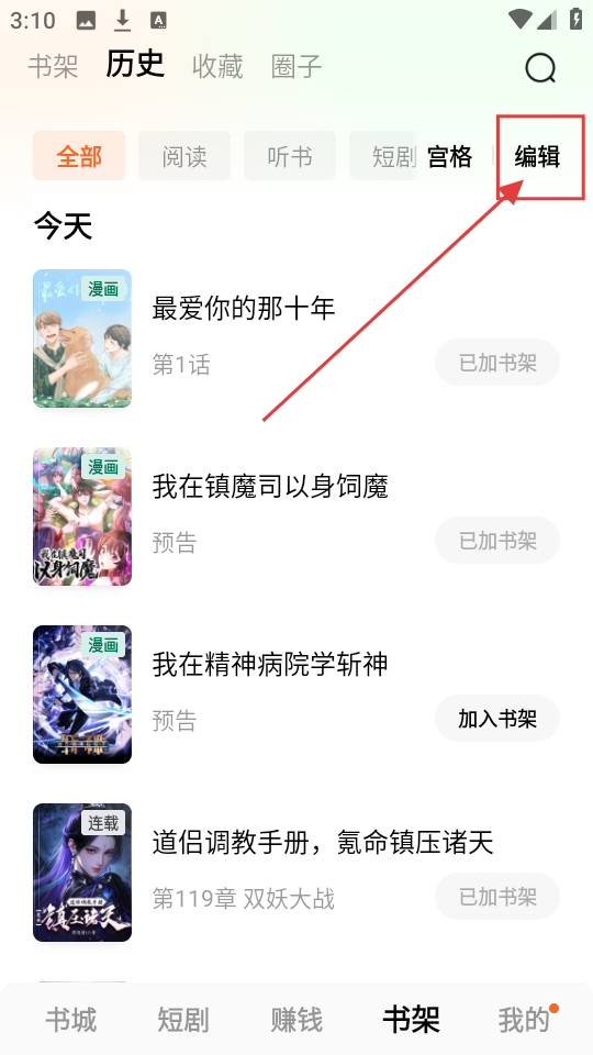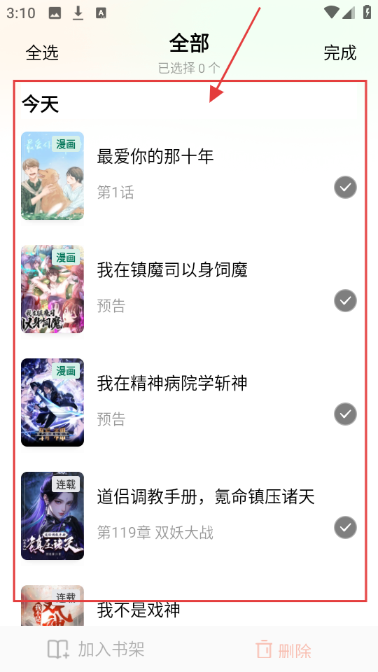 4、进入编辑模式后,能看到所有可操作的历史内容,勾选后可进行加入书架或删除等操作,超便捷哦。