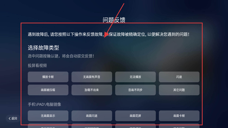 3、在问题反馈界面选择故障类型,选中后即可自动提交反馈,助力解决问题哦。