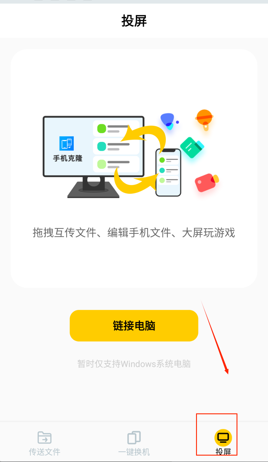 3、投屏功能能让手机画面显示在电脑上,在“投屏”页面点击链接电脑,按照指引操作即可。连接成功后可以用电脑大屏操作手机。