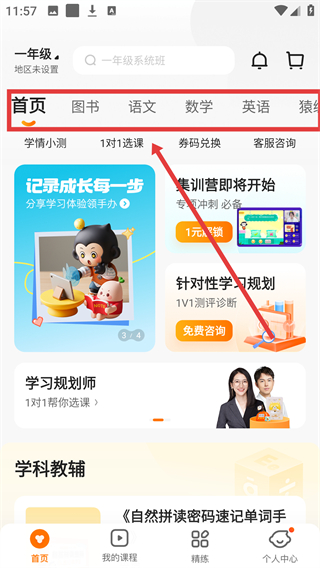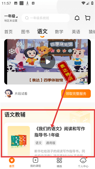 2、进入语文板块后,找到【《我们的语文》阅读和写作指导书-1年级】,点击进入详情页啦。