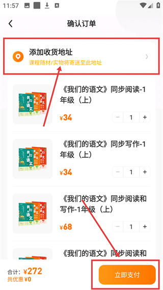 4、在确认订单页先添加收货地址,再点击【立即支付】就能完成教辅资料的购买啦。