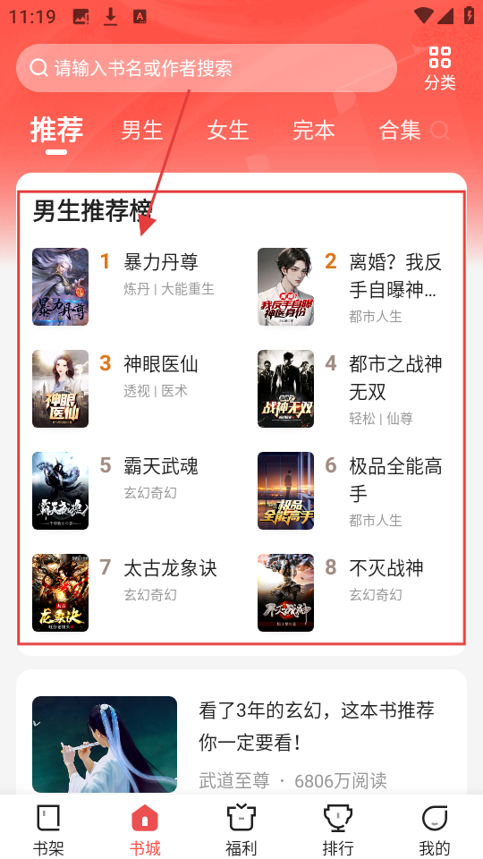 1、在书城推荐里,看到感兴趣的小说比如【暴力丹尊】,点击进入详情页吧。