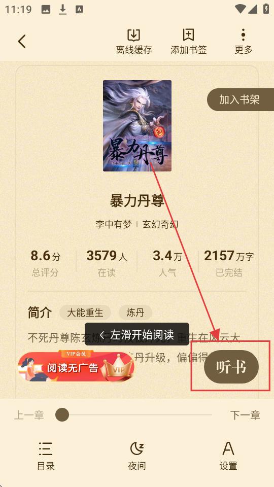 2、进入小说详情页后,点击【听书】按钮,就能开启听书模式啦。