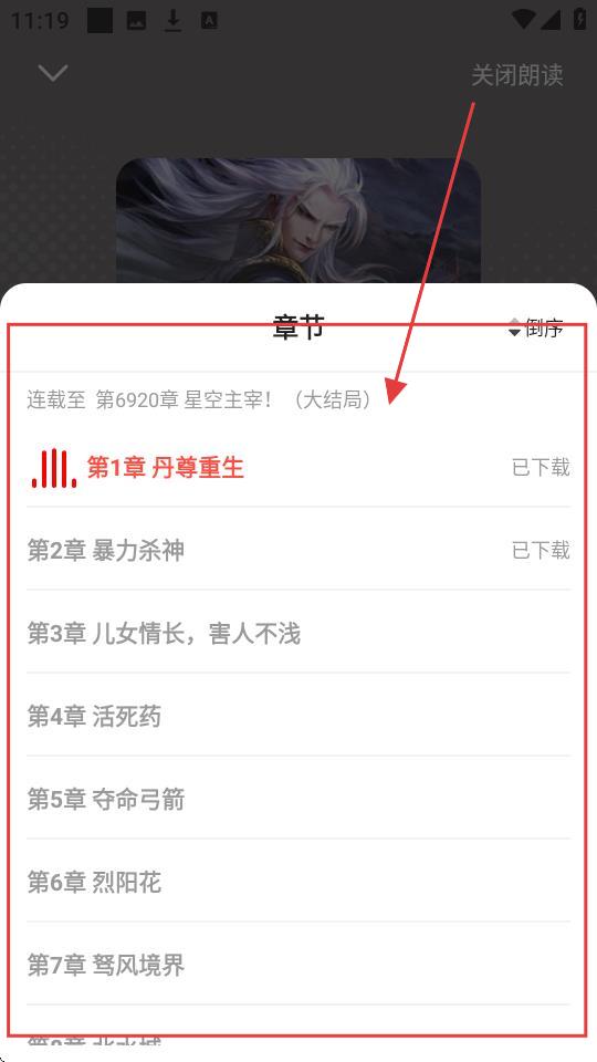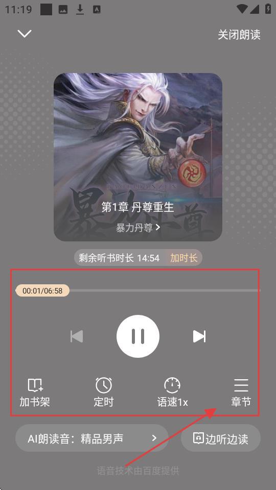 4、点击【章节】,就能选择想听的章节,比如【第1章丹尊重生】,超容易操作的哦。