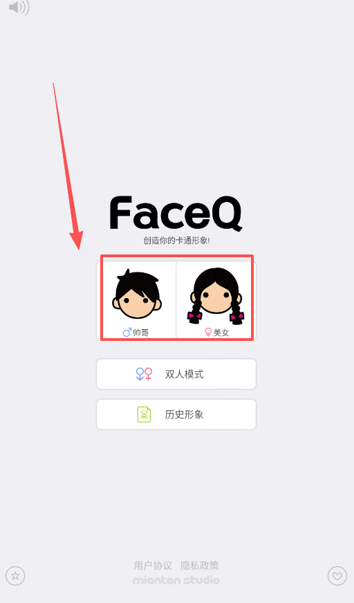 1、打开软件后,你会看到主界面,可以选择“帅哥”或“美女”模式来创建单人卡通头像。