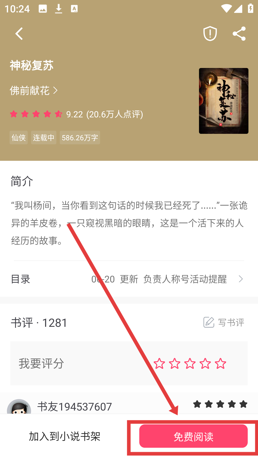 4、在小说详情界面点击【免费阅读】,即可开始阅读该小说,沉浸在剧情里啦。