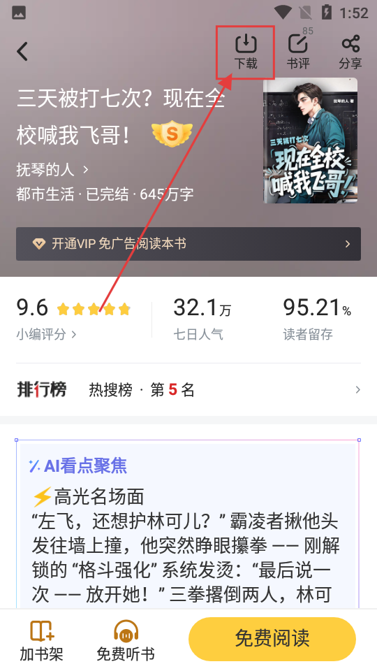 2、进入小说详情页,能看到评分、人气等信息,若要下载小说,点击【下载】哦。