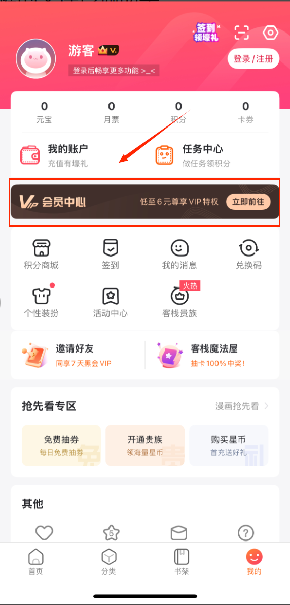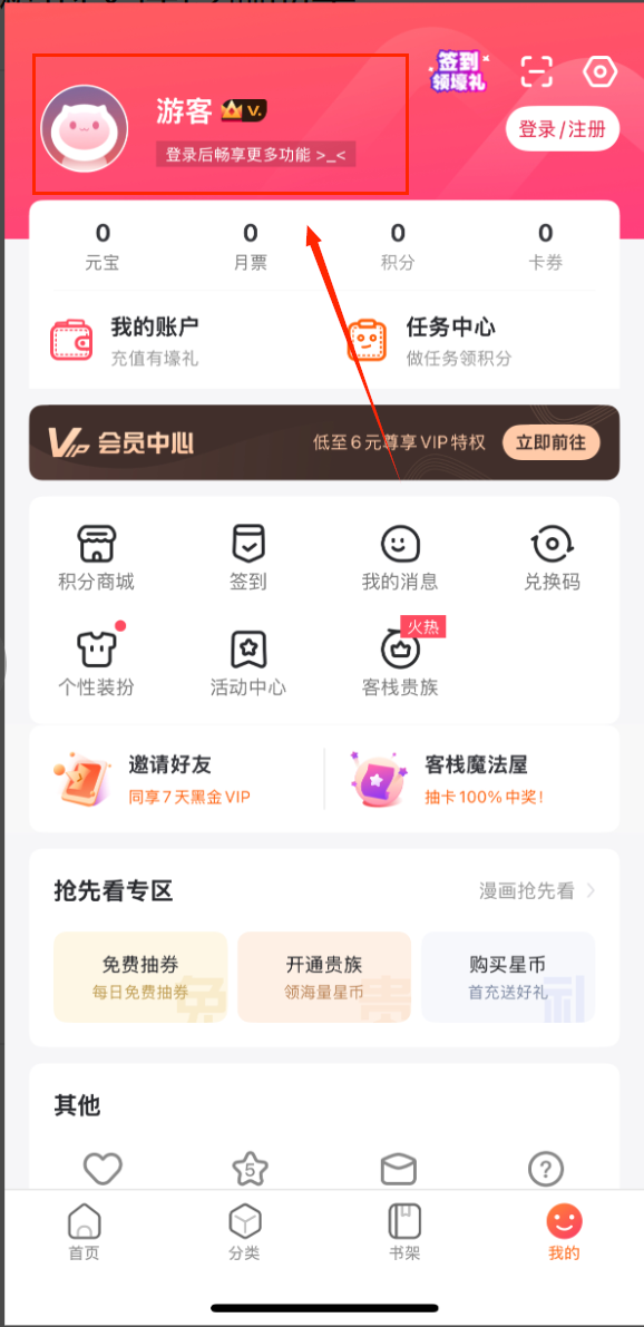 1、要享受完整功能需要先登录账号,在“我的”页面顶部点击“登录/注册”,新用户注册或老用户登录后就能同步阅读历史和使用VIP特权啦。