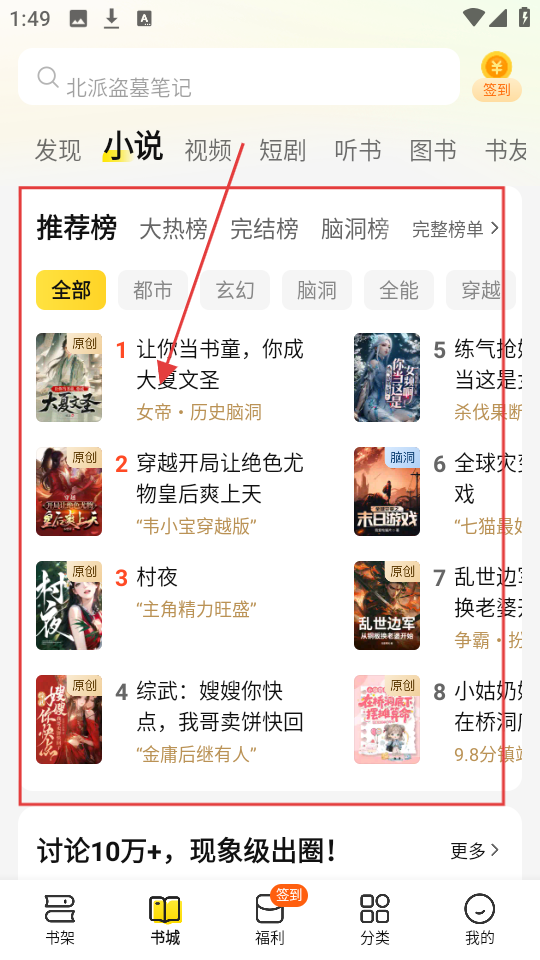 1、进入书城后,推荐榜里有好多精彩小说,像【让你当书童,你成大夏文圣】就很吸引人,快选一本喜欢的吧。
