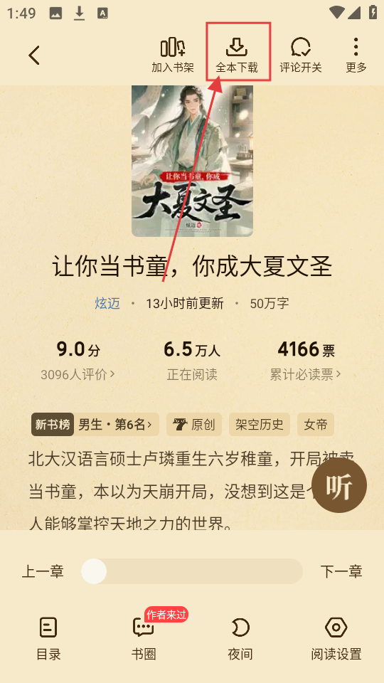 2、选好小说进入详情页,要是想离线看,就点击上方【全本下载】,这样就能触发下载选项啦。
