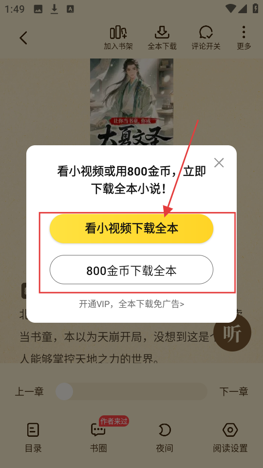 3、触发下载后,会弹出下载选择框,你可以选【看小视频下载全本】或者【800金币下载全本】,选一个就能下载啦。