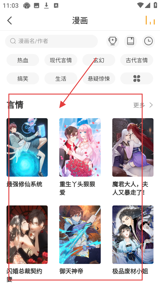 2、进入漫画页面后,有热血、现代言情等分类,还有言情类漫画推荐,挑选一本感兴趣的,点击就能进入漫画详情页咯。