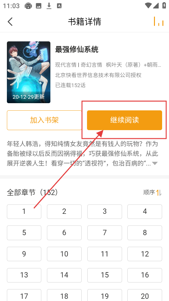3、到了漫画详情页,像《最强修仙系统》的详情页,有【继续阅读】按钮,点击它就能接着看漫画内容啦。