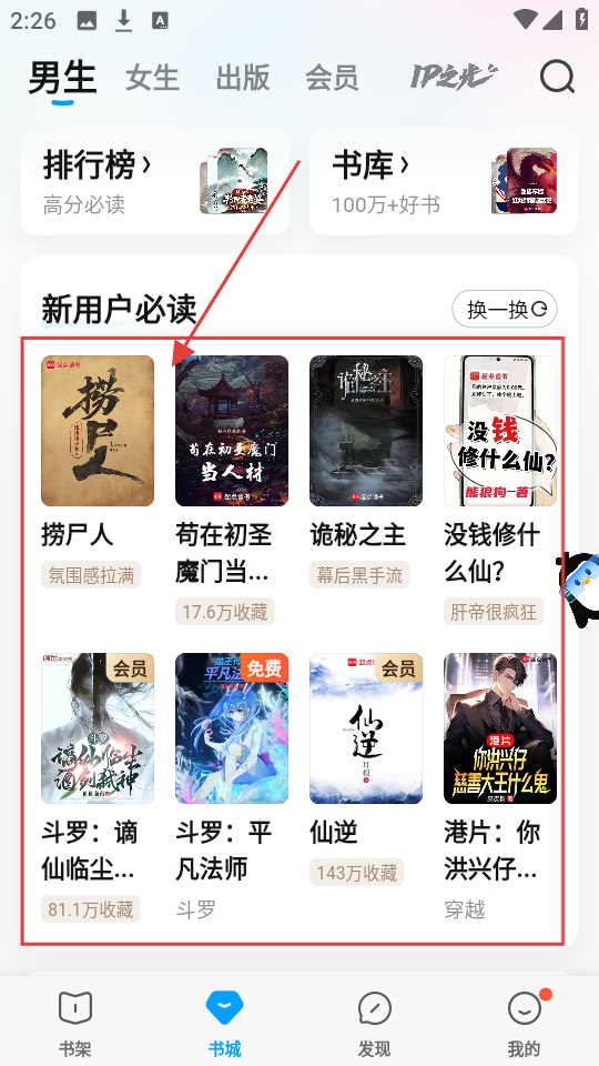 1、在软件书城页面,找到“新用户必读”区域,里面有不少推荐书籍,选择感兴趣的书籍,点击进入其详情页啦。