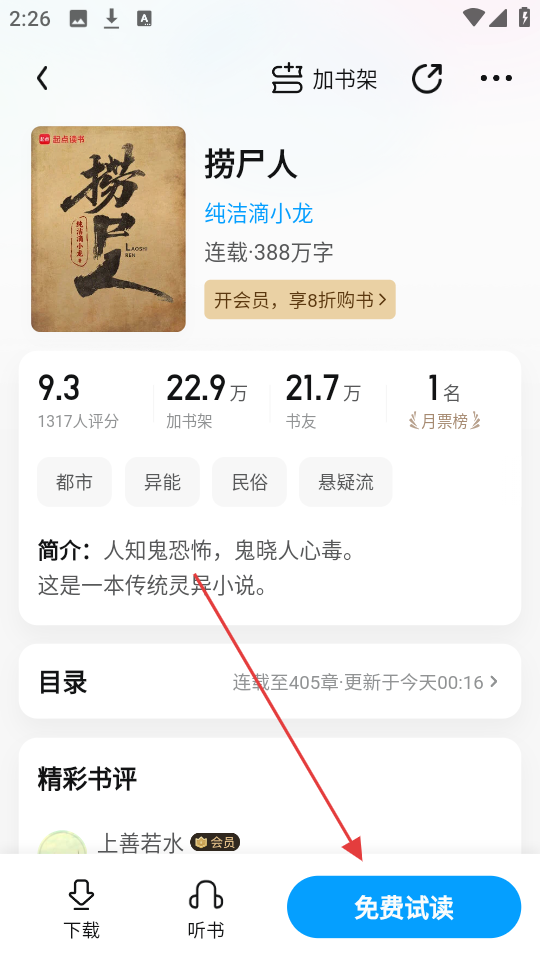 2、进入书籍详情页后,若想先体验阅读,点击【免费试读】按钮,就能进入书籍阅读界面,开始试读啦。
