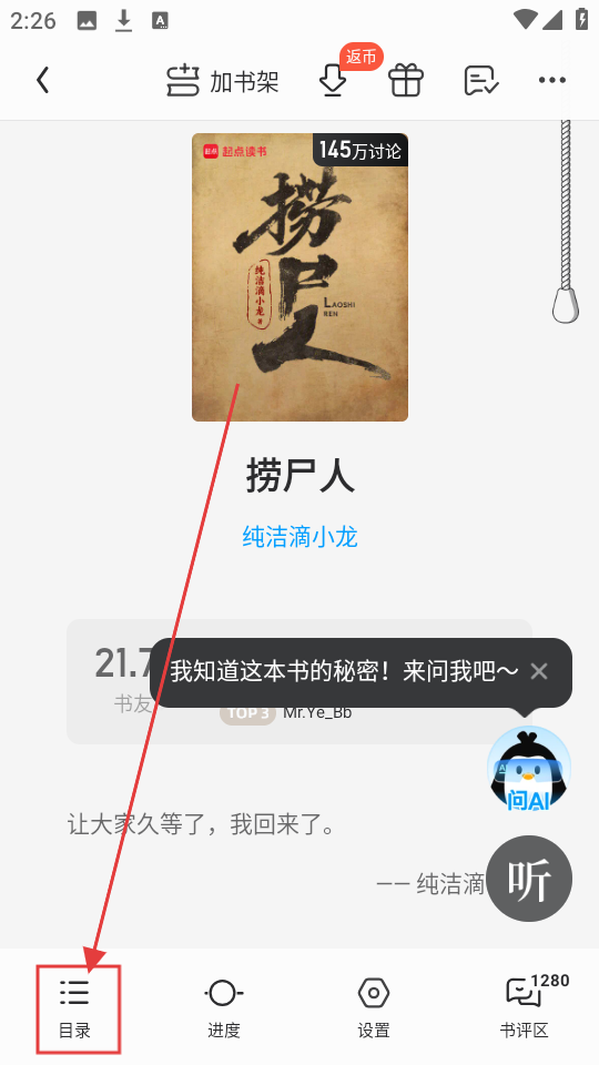 3、进入阅读界面后,点击界面,下方会出现功能栏,找到【目录】按钮,点击它就能查看书籍的章节目录啦。