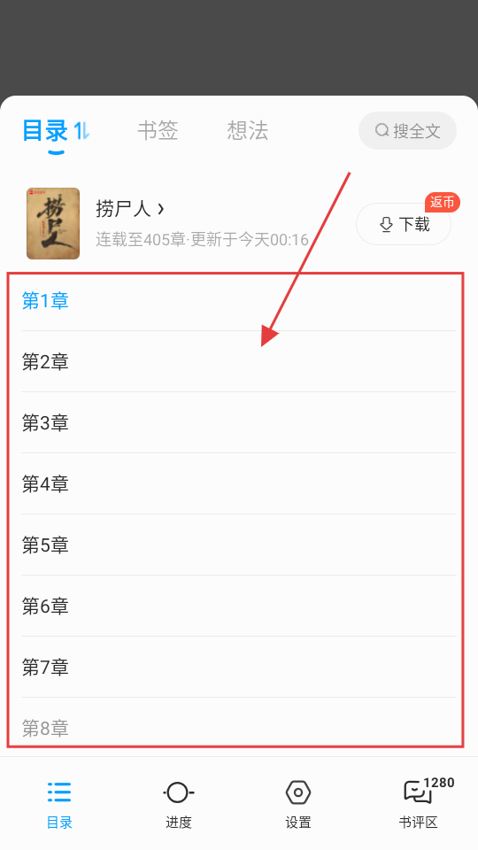 4、点击“目录”后,会弹出章节列表,里面清晰列出各章节,可根据需求选择想要阅读的章节,点击进入阅读哦。