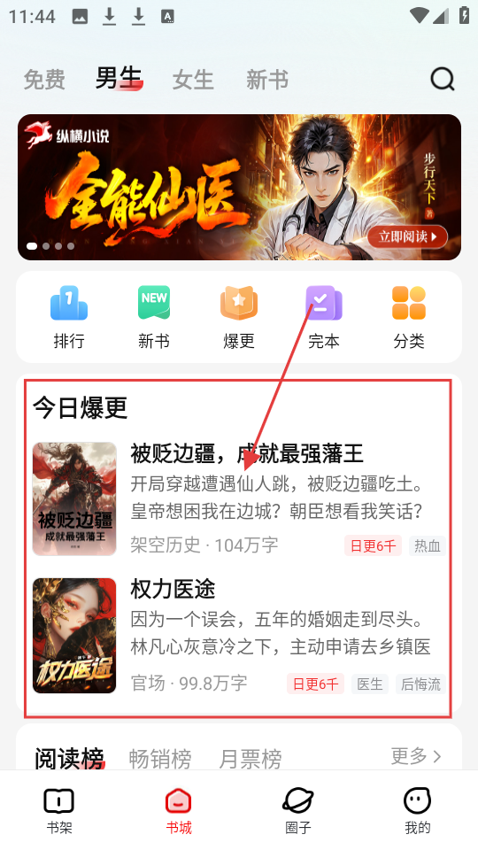 1、进入书城,在【今日爆更】板块找到《被贬边疆,成就最强藩王》,点击进入小说详情页吧。
