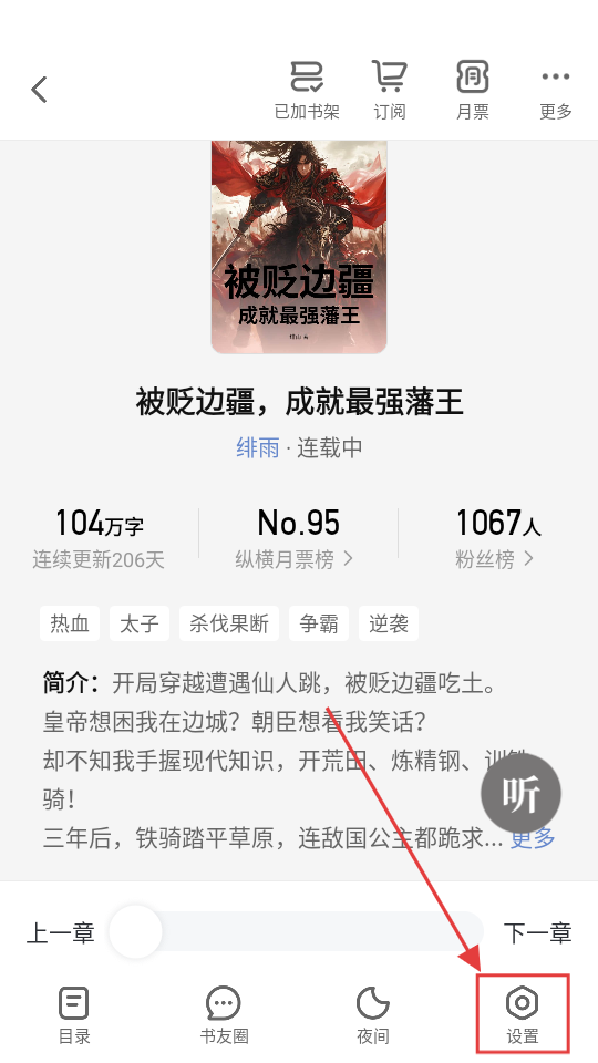 2、在小说详情页,点击右下角【设置】按钮,可进入阅读设置界面,调整阅读相关选项哦。