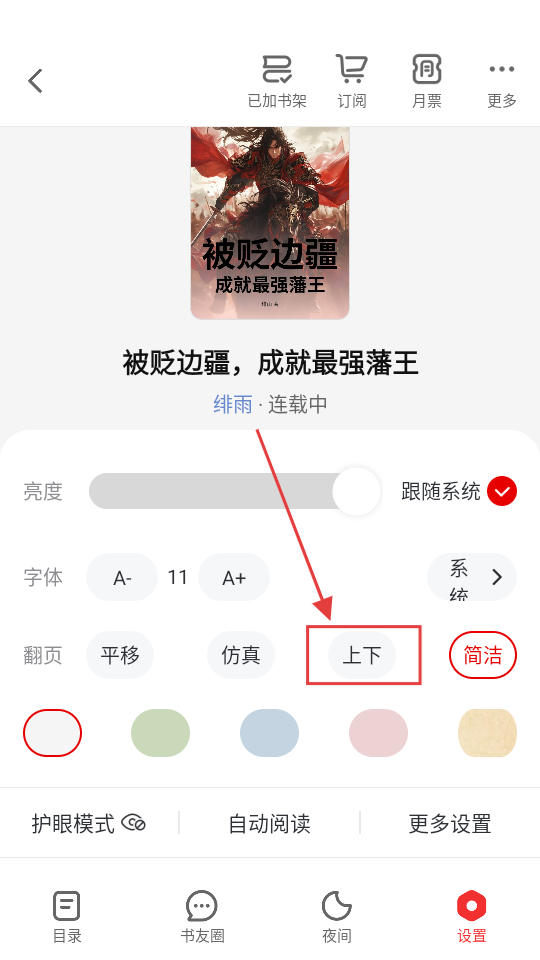 3、在设置界面,选择【上下】翻页模式,这样阅读时翻页更符合习惯,提升阅读体验啦。