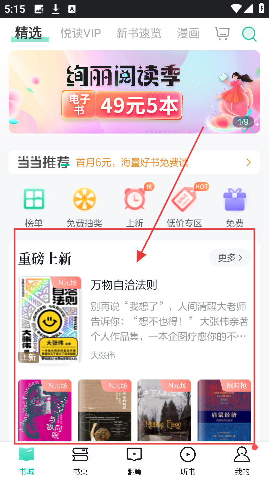 1、若想试读新书,在书城“重磅上新”区选一本,比如【万物自洽法则】,点击进入详情页。
