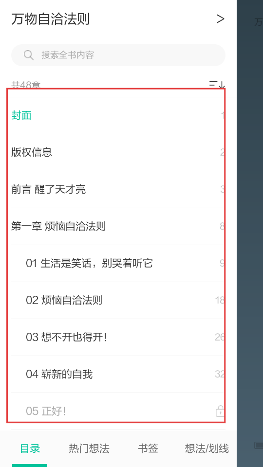 4、在目录页面,能看到【封面】【版权信息】等内容,还有各章节,方便选读。