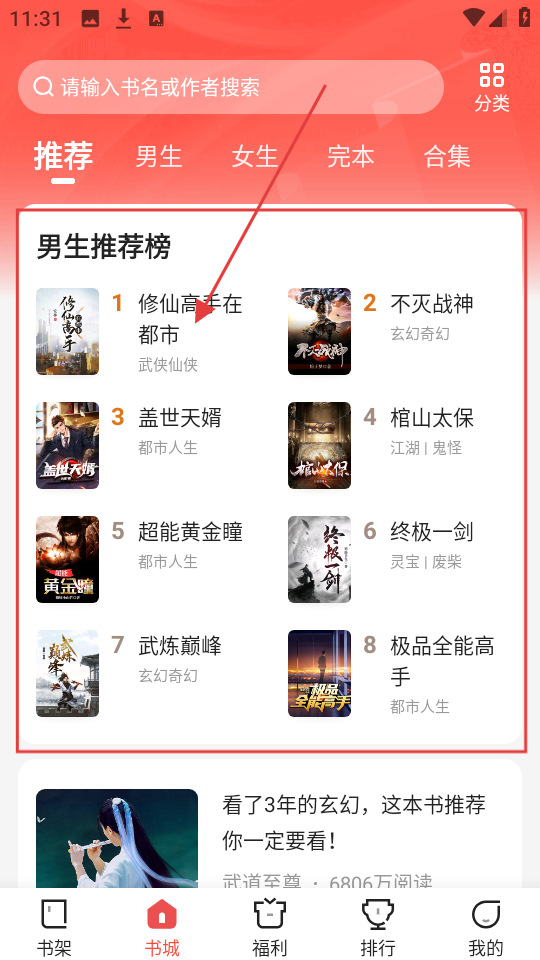 1、在书城男生推荐榜里,看到感兴趣的小说比如【修仙高手在都市】,点击进入详情页吧。