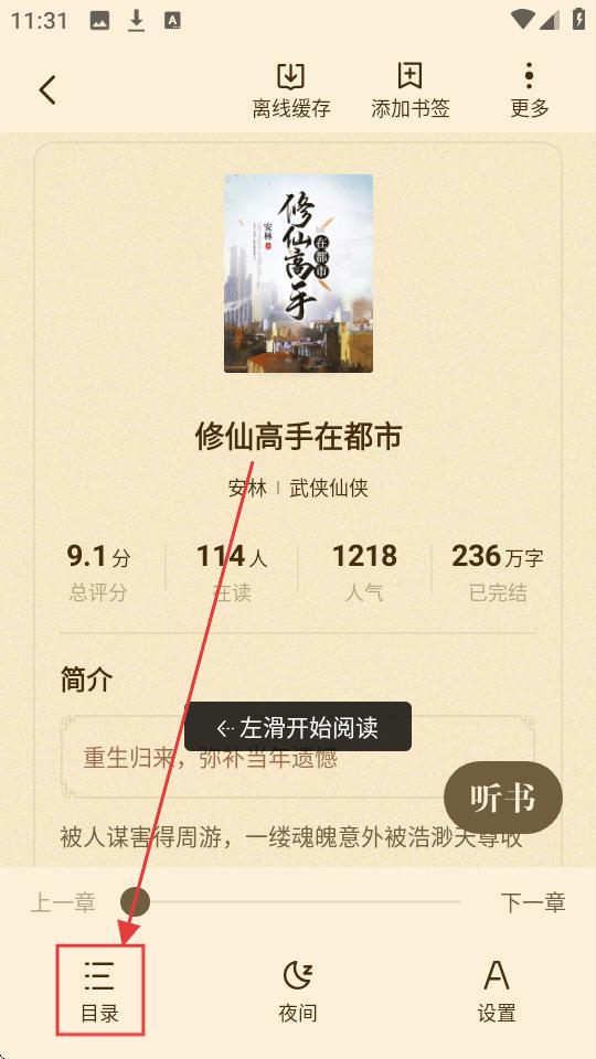 2、进入小说详情页后,点击【目录】按钮,就能查看小说的章节列表啦。