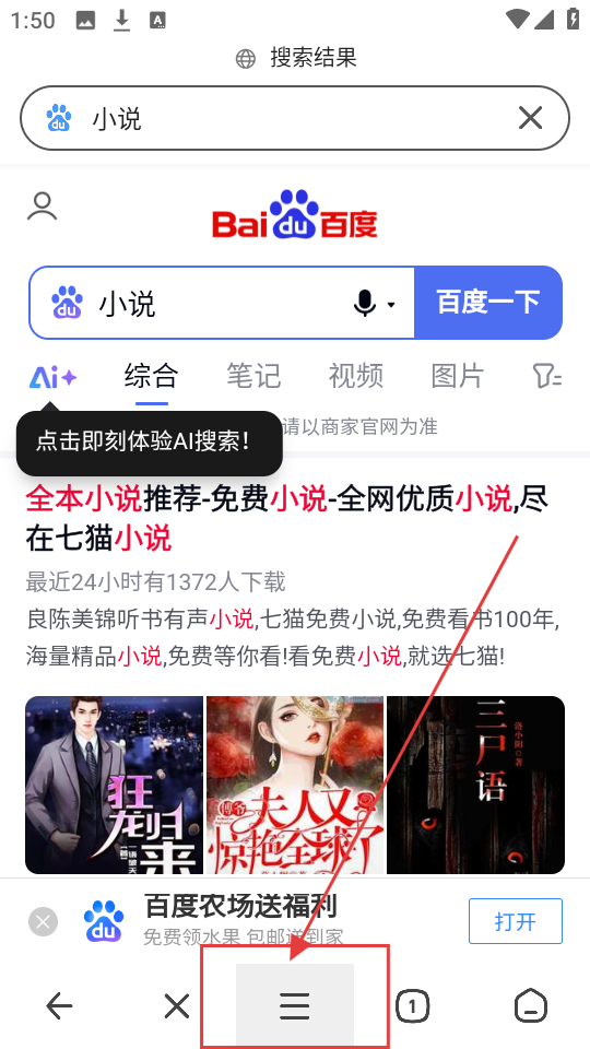 1、想收藏网址,就点击底部【菜单】按钮,超容易找到收藏入口的呢。