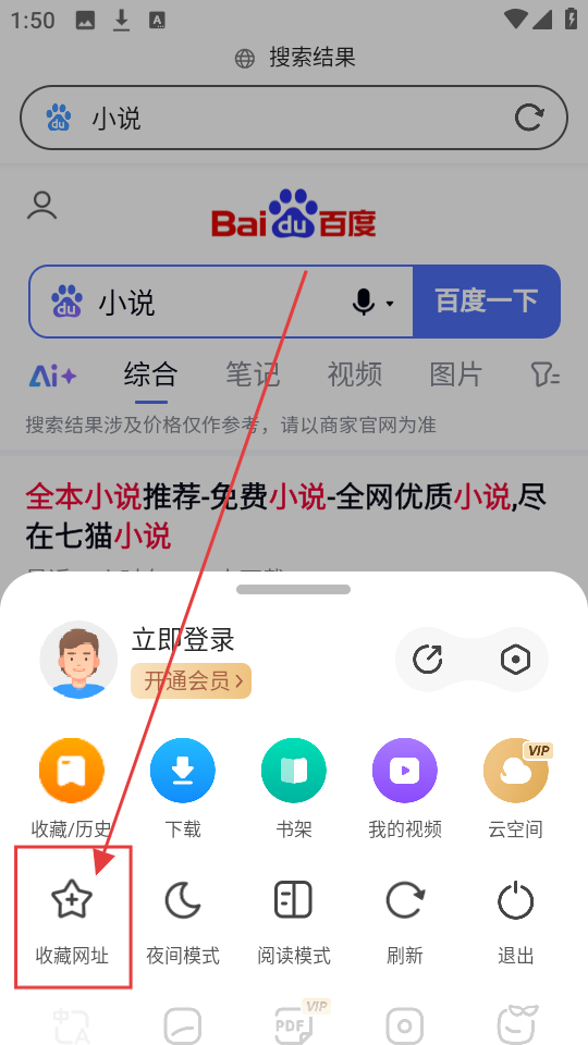 2、展开菜单后,点击【收藏网址】选项,就能把当前页面收藏起来啦。