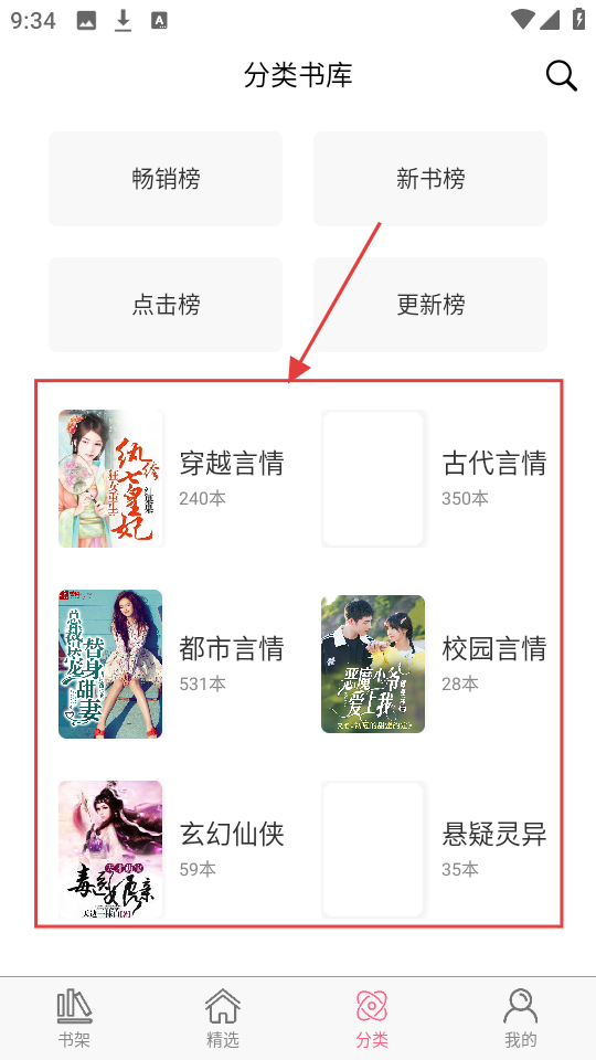1、分类书库有多种小说分类,选【穿越言情】这类感兴趣的,就能找到相关小说啦。