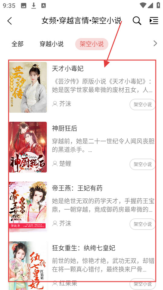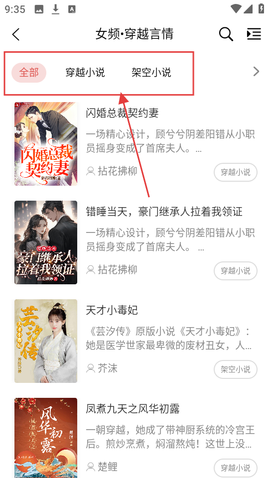 2、进入穿越言情分类后,可选择【架空小说】等子分类,精准找到想看的小说哦。