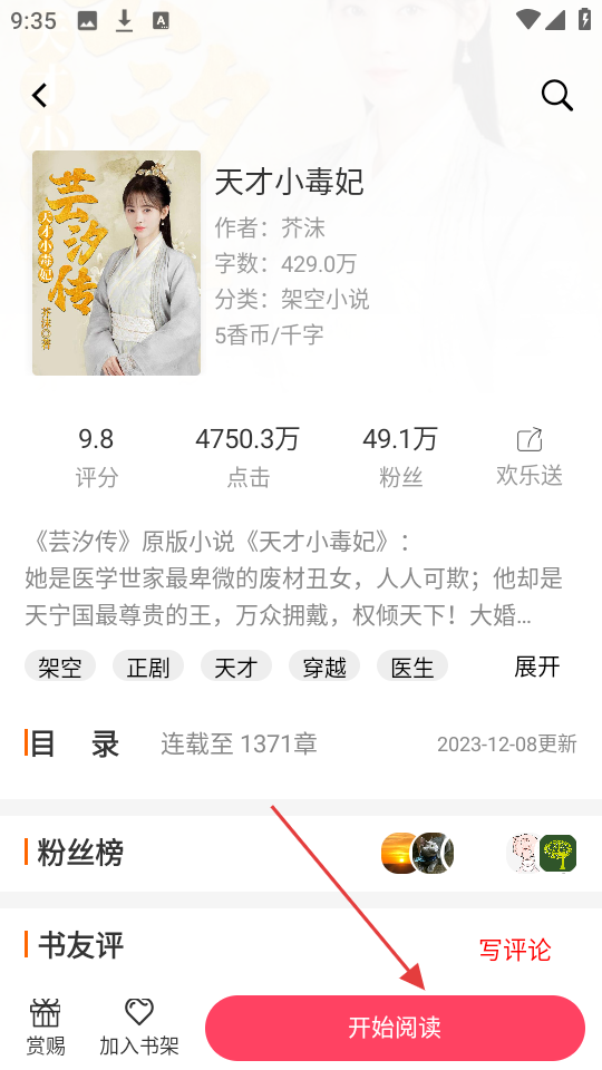 3、在架空小说列表里,挑一本喜欢的,比如【天才小毒妃】,点进去看看详情吧。