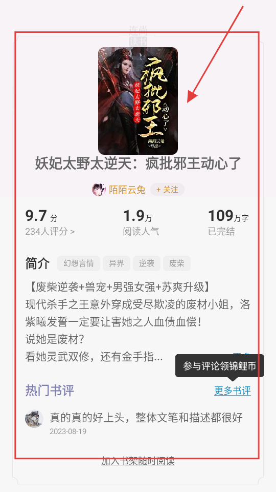 1、打开APP首页,在推荐榜里选想看的小说,比如【妖妃太野太逆天:疯批邪王动心了】,进入小说详情页面,准备阅读啦。