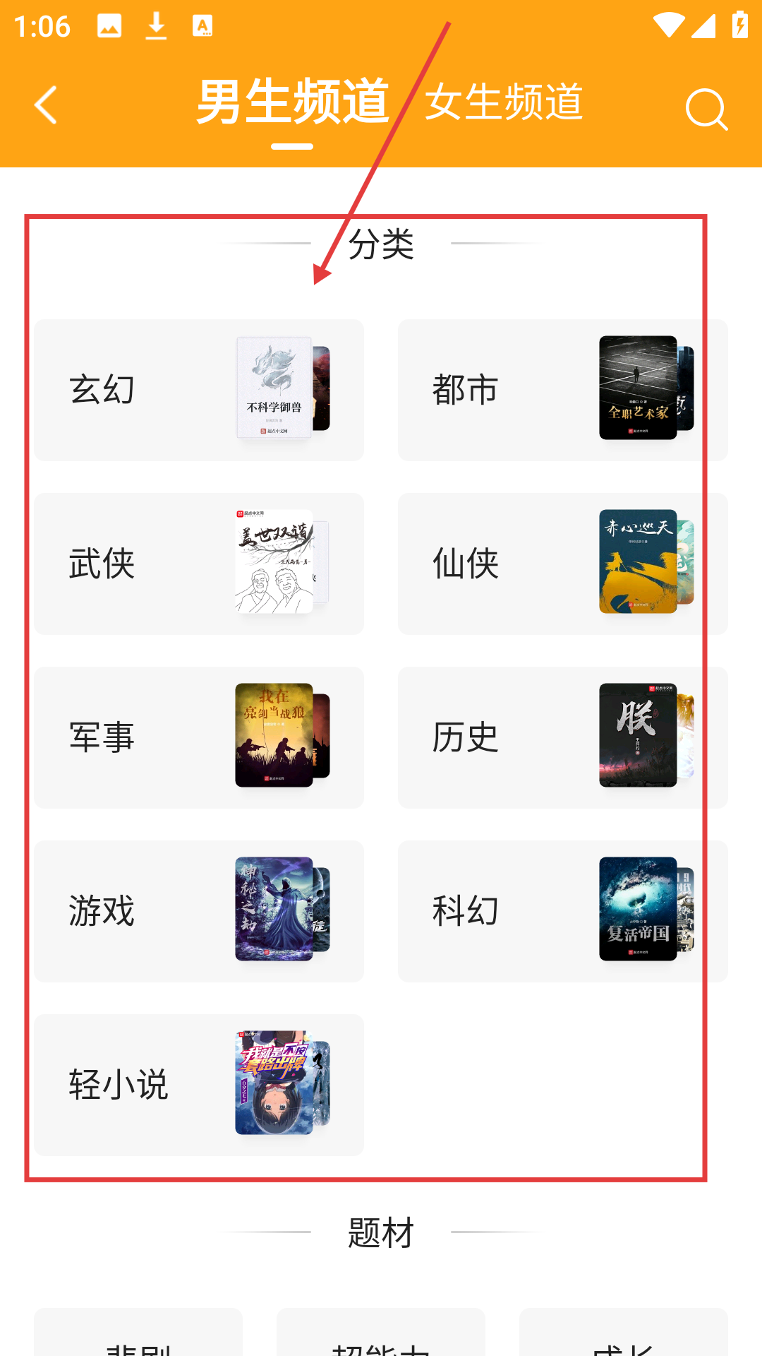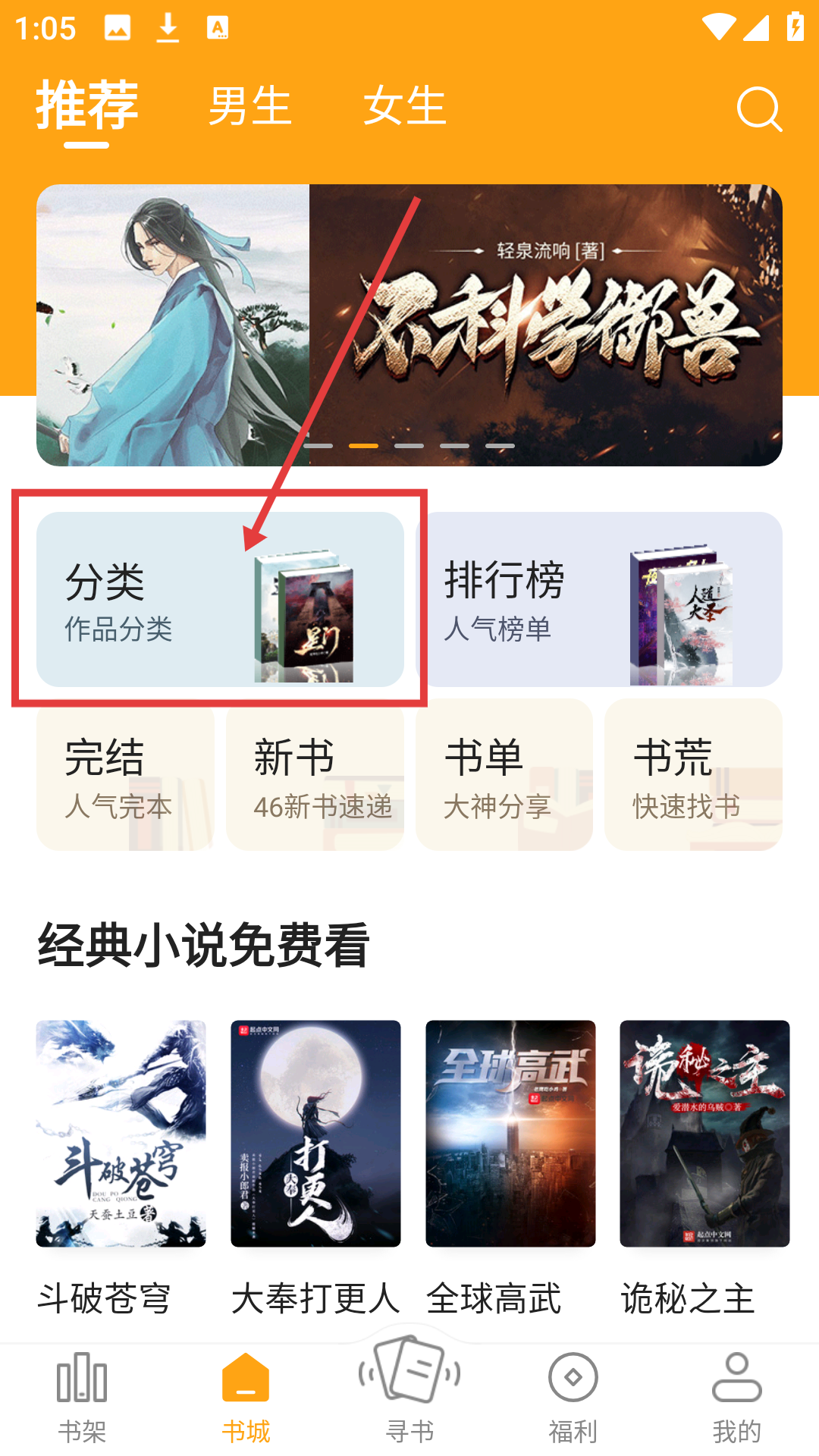 1、在书城推荐页面,点击【分类】,可进入作品分类页面,准备选择小说类型啦。