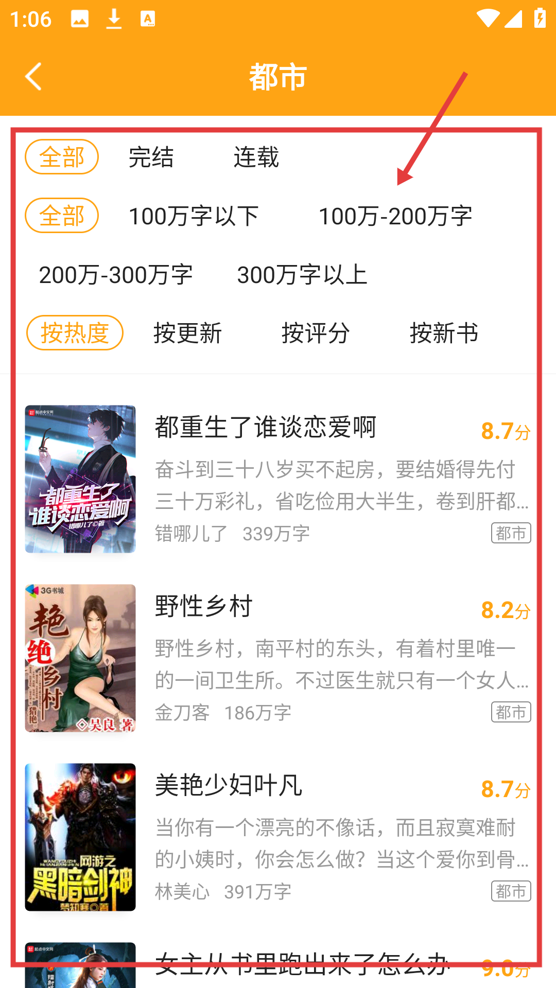 2、进入分类页面后,选择喜欢的类型,如都市,可进入都市小说列表页哦。