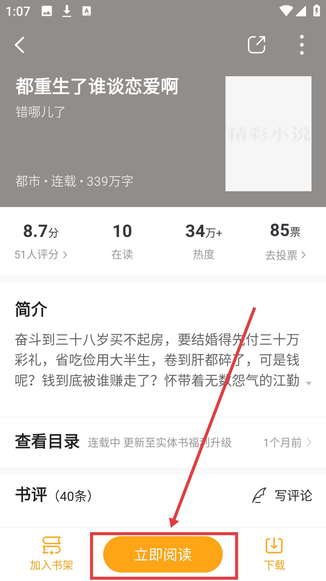 4、进入小说详情页后,点击【立即阅读】,即可开始阅读该小说,享受阅读时光哦。