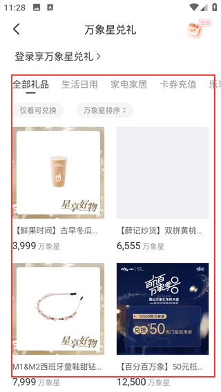 2、进入万象星兑礼页面后,能看到各类礼品分类,选择心仪的礼品(如鲜果时间饮品),即可查看兑换详情哦。