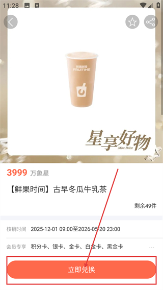 3、进入礼品详情页,确认所需万象星数量后,点击【立即兑换】按钮,触发兑换流程啦。
