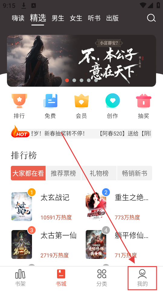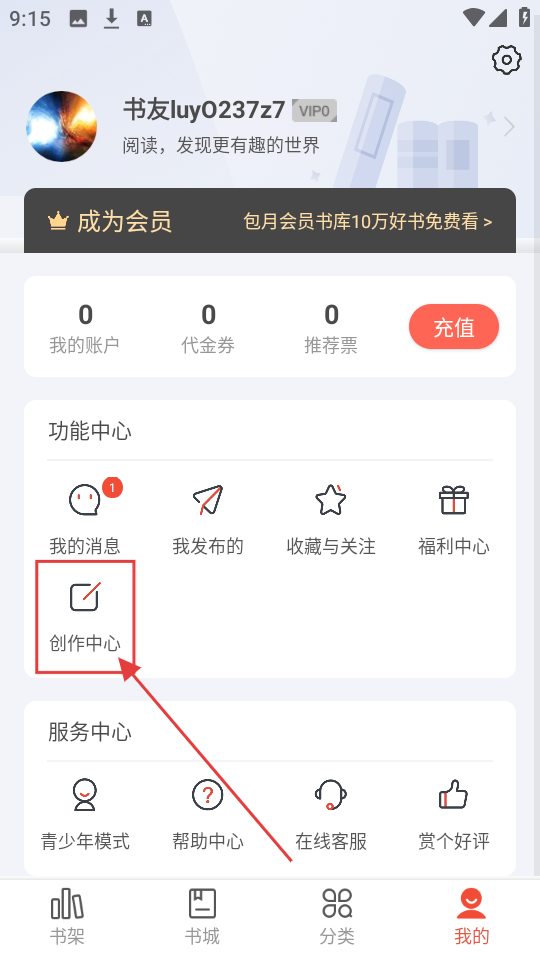 1、打开APP,点击右下角【我的】,进入个人页面,准备开启小说创作之旅啦。