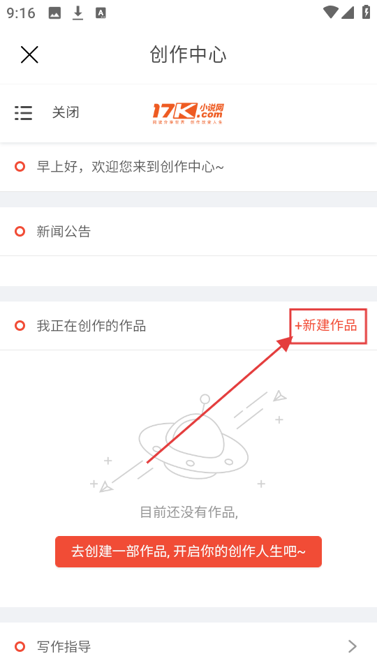 3、在创作中心页面,点击【+新建作品】选项,进入成为作者的流程呢。