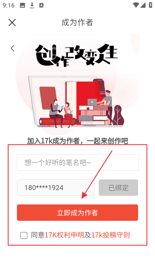 4、在成为作者页面,填写笔名,同意相关规则后点击【立即成为作者】,即可开启小说创作生涯啦。