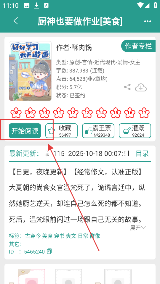 1、想看书时,选一本喜欢的,比如【厨神也要做作业[美食]】,点击【开始阅读】进入阅读页。